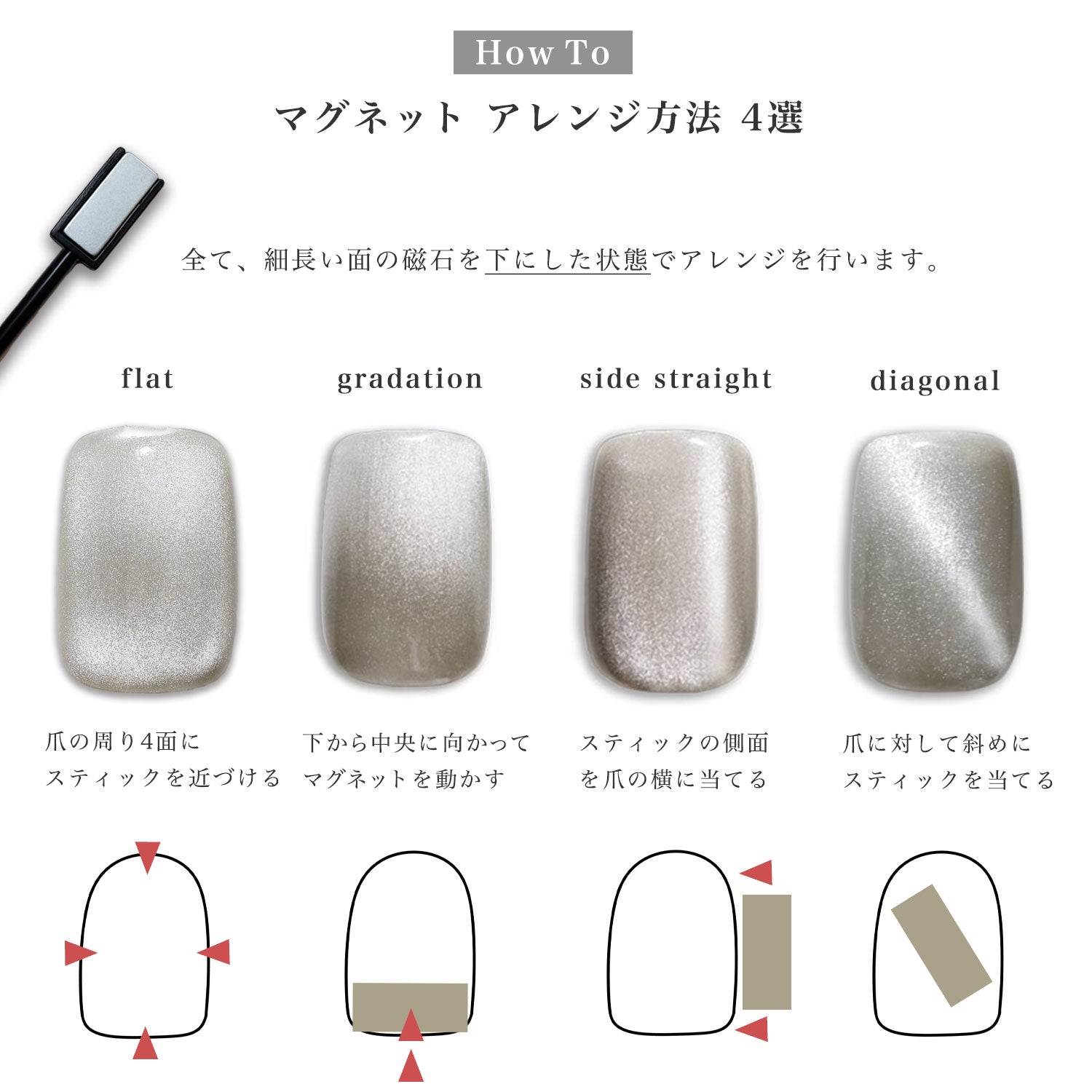 ・LEDライトでの硬化が必要です。マグネットジェルは塗布・硬化後に未硬化ジェルが出るため、トップジェルまたはビルダージェルを塗布・硬化してください。