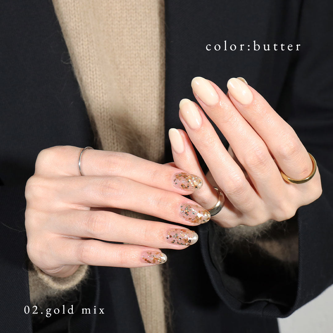 butterという名前から黄色っぽい色なのかと届くまで相当不安でしたが黄色みはなく、肌なじみのいいオフホワイトでした✨️まさに欲しかったカラーでよかったです。romance、peonyと共にねこネイルしましたっ🐈‍⬛🎀